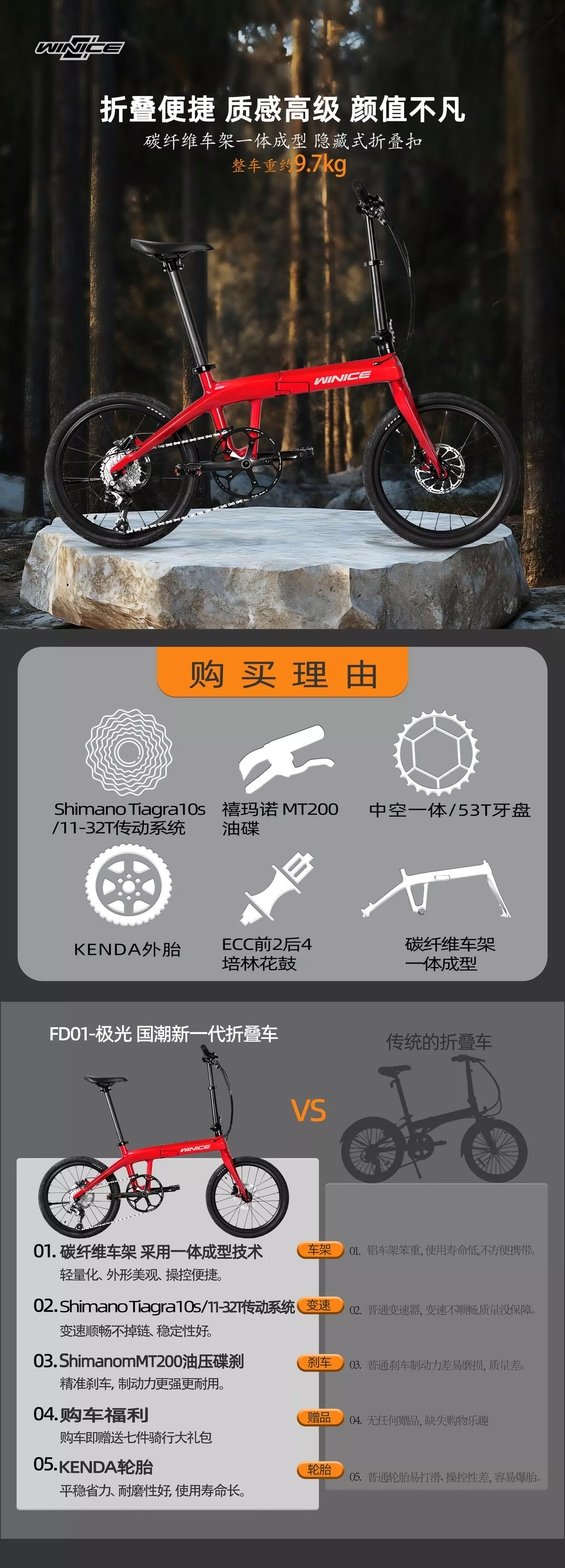 如果你正在寻找一款全新的折叠自行车,那么WINICE“极光”就是你的不二之选,折叠尺寸小巧,方便收纳,可放入汽车后备箱或公共交通工具的储物区;采用快速折叠机构,可在数秒内轻松折叠和展开;小巧的车轮和紧凑的车架,可在城市交通中机动自如;采用碳纤维等轻质耐用材料制成,可调节座杆,适用于不同身高的骑行者。